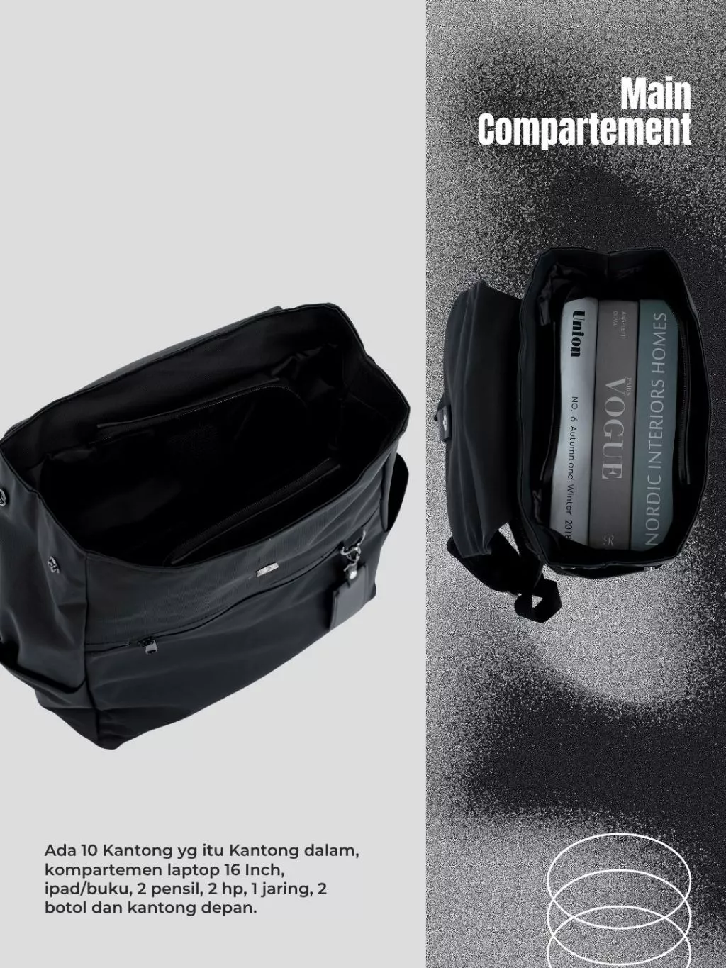 Organized 10 Kantong: kompartemen utama, sleeve laptop, saku depan ber-zip, 2 saku botol, saku jaring & organizer (HP, pensil, dll).