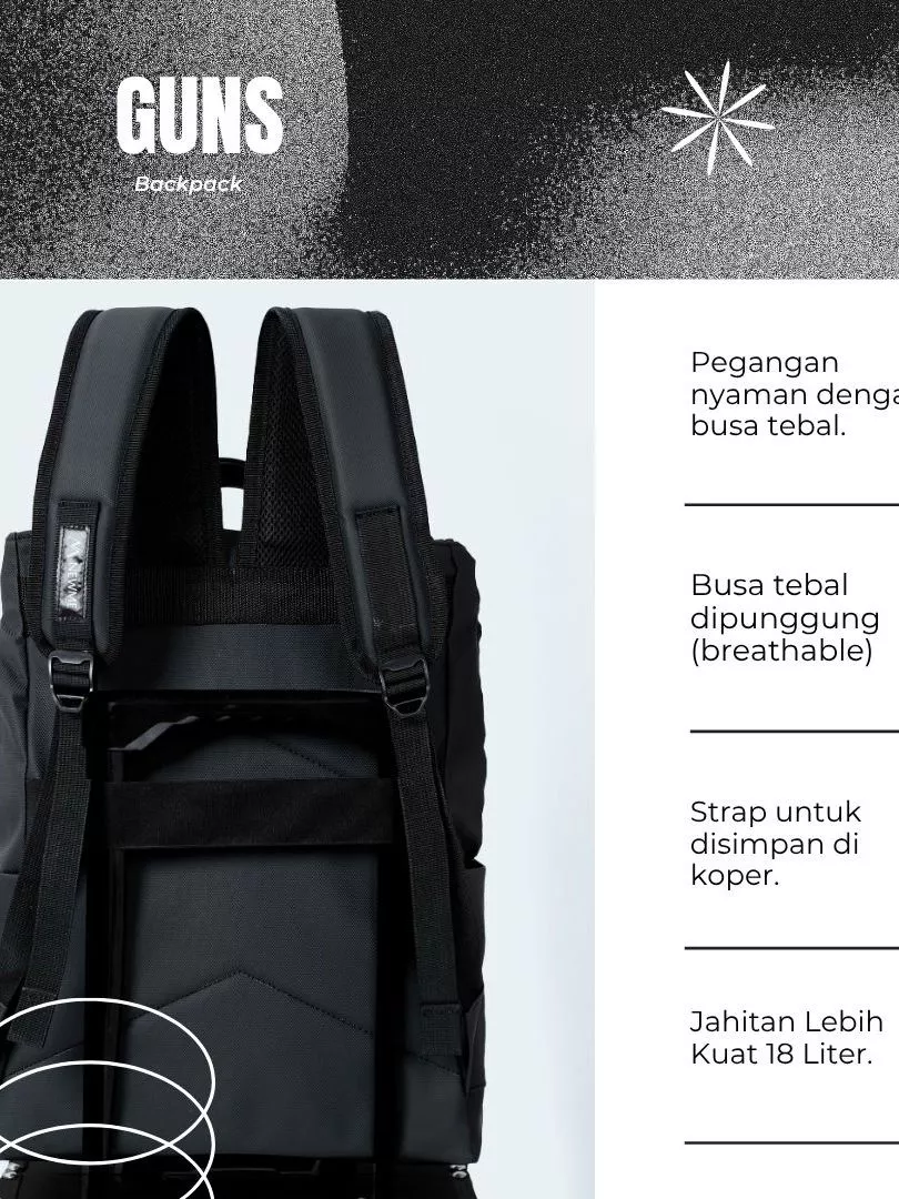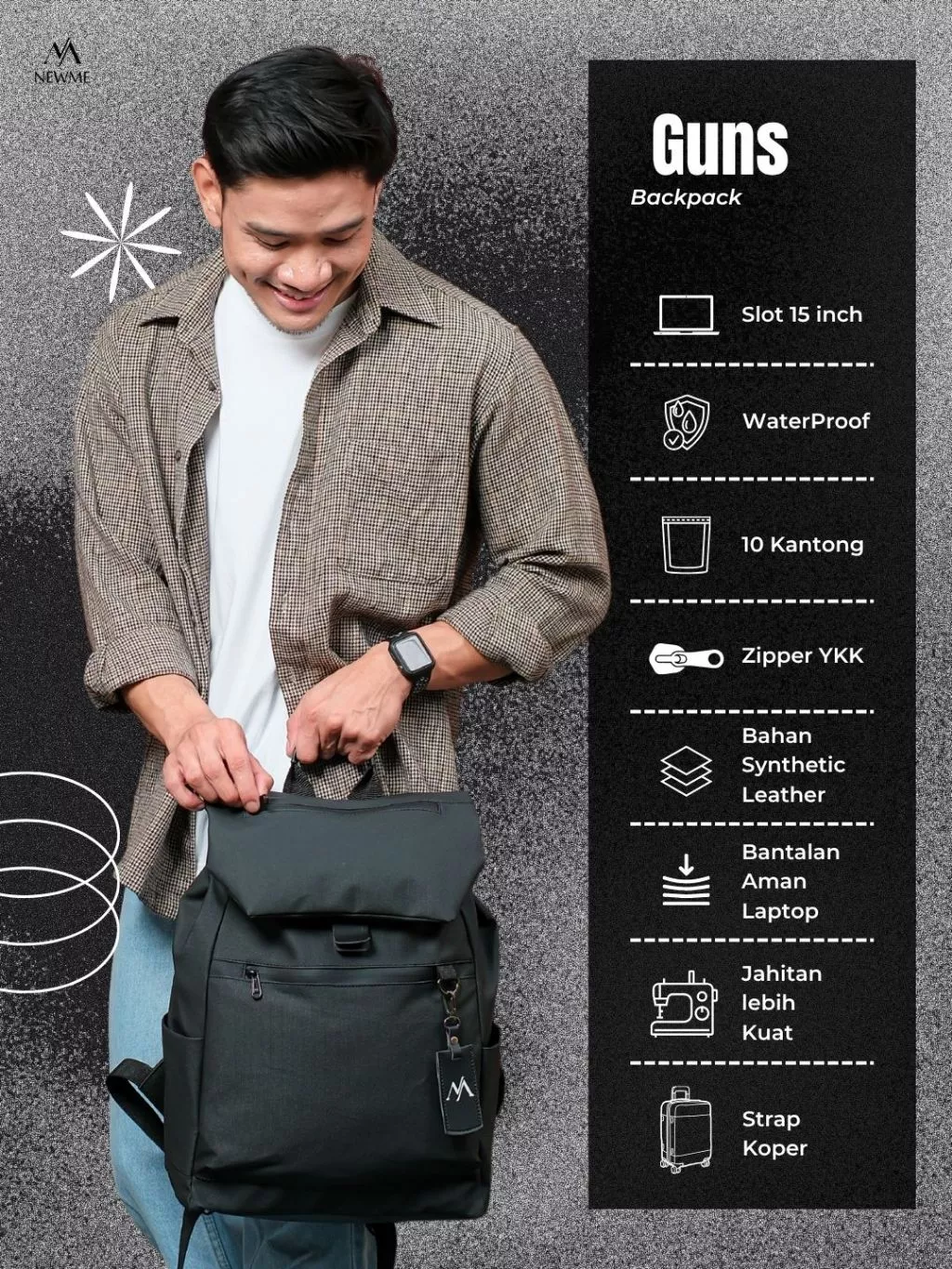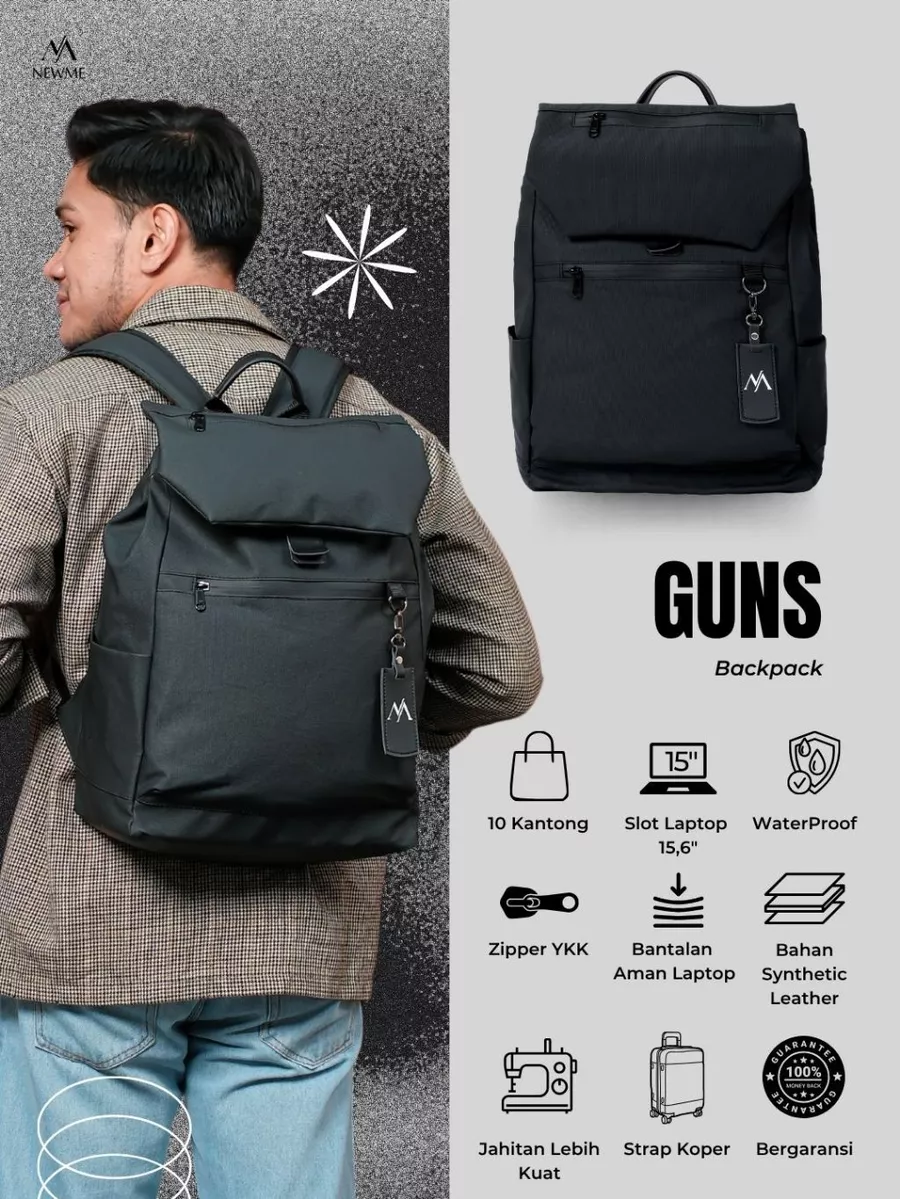NEWME GUNS Backpack adalah ransel harian yang memadukan tampilan minimalis dengan fungsi maksimal. Bahan waterproof yang tebal, Zipper YKK yang awet, serta sleeve laptop 15.6” ber-foam padded memastikan perangkat dan barangmu aman saat komuter, kuliah, kerja, hingga short trip.